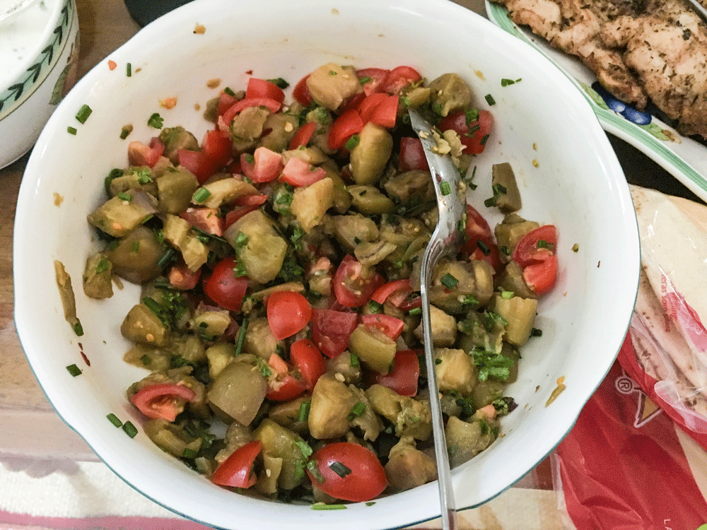 4. when the aubergines are cooked (about 20-30 minutes), poor in a salad dish